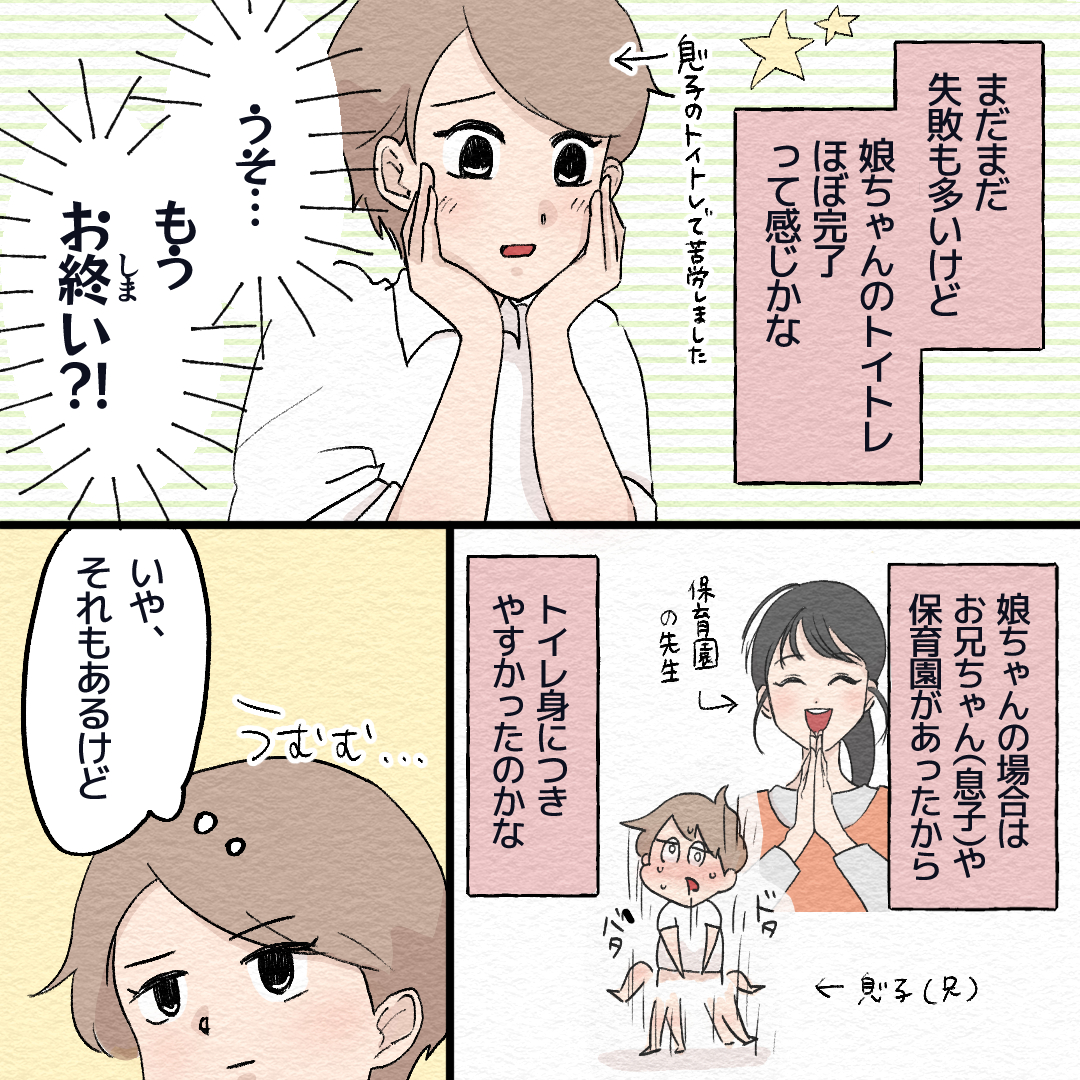 2歳のトイトレ 12歳のトイトレ 第1話 めちゃくちゃ大変だった うちの息子のトイトレ漫画はこちら▽ さて本編です! あとがき 難航する息子(兄)のトイトレ中、なんの気なしに 当時1歳4ヶ月の娘をトイレに座らせてみたら… で、出た!!! 当時3歳の息子がまだ...